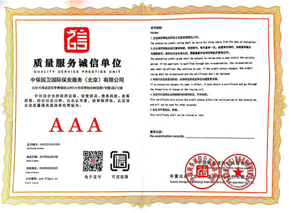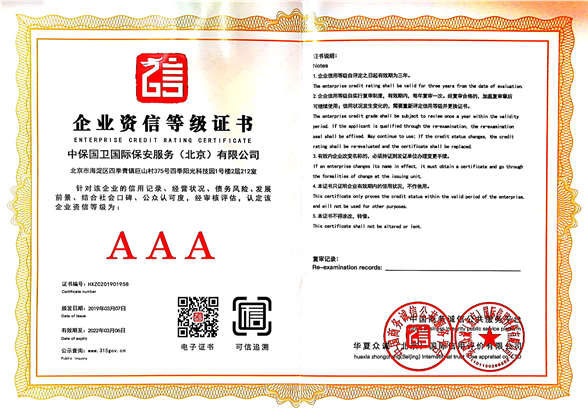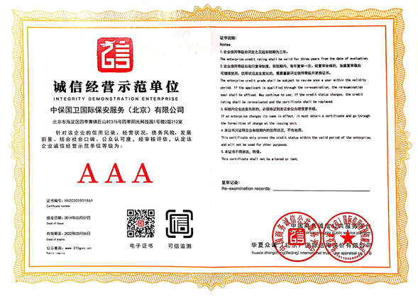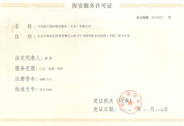 中保國衛國際保安服務(北京)有限公司,屬中保國衛集團旗下子公司。能全方位的為大型客戶提供優質的安保、押運服務,是集人防和技防于一體的新型正規化綜合安保押運服務企業,提供人防、物防、技防、聯網報*、非武裝押運等安防相關的一站式服務。 公司在國內多省設立有分公司及分支機構,著重提升安全押運、智能技術押運及安全技術防范相關的服務,業務范圍覆蓋全國一、二線城市、港澳地區以及海外地區。安保方面主要為政府機構、金融機構、企事業單位、醫療衛生、高等院校、工業園區、大型商場、高檔住宅、智能商務樓、大型活動提供門衛、守護、巡邏、押運(非武裝)、安全檢查、保安特勤、私人護衛、消防中控、安全技術防范、遠洋護航等全方位服務,同時面向國際市場,為中資企業在“一帶一路”沿線國家投資提供境外安保服務。 >> 更多內容 |